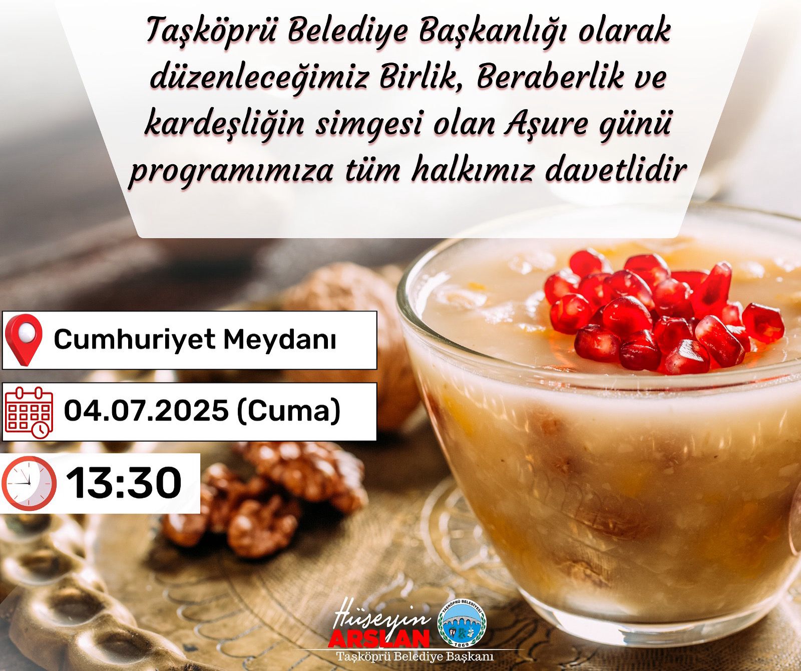 Taşköprü Belediye Başkanlığı’ndan yapılan açıklamada, bu anlamlı günde tüm vatandaşlar davet edilerek, “Gelin, aynı kazanda kaynayan aşurenin bereketinde buluşalım; birliğimizi ve kardeşliğimizi birlikte pekiştirelim” ifadelerine yer verildi.
